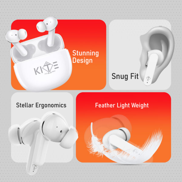 Kite Zeal is ultra light-weight – each earbud weights only 3.5 gms. You can take calls, binge watch or listen to music for long hours without feeling any pain while wearing these snug fit and feather-light earbuds.